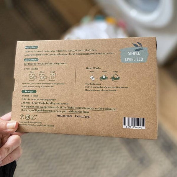De duurzame wasstrips van Simple Living Eco bevatten, in tegenstelling tot veel andere "groene" opties op de markt, geen plastic afval. Bovendien is de verpakking 100% recyclebaar. De wasstrips zijn volledig biologisch afbreekbaar en een veel vriendelijker en veiligere optie voor het milieu, uw huid en uw kleding.